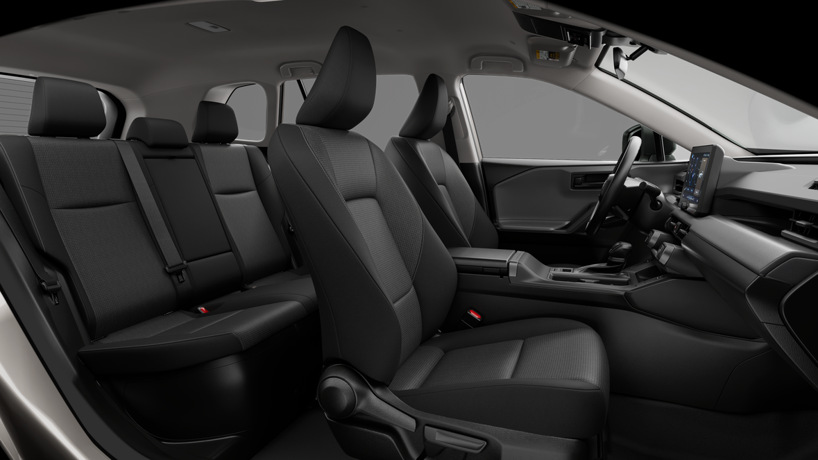 - Fabric-trimmed seats; 6-way manual front seats with seatback pocket